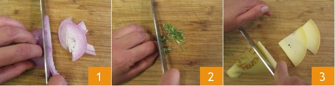 To make the multi-flavor puff pastry, clean and thinly slice the onions, then pluck the thyme leaves, chop the rosemary needles 2 and the chives. Also, cut the caciocavallo cheese into thin slices 3 and set aside.