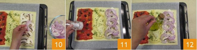 and onions 10. Season with salt 11 and olive oil 12, then bake in a static oven at 375°F for about 15 minutes on the middle rack.
