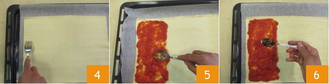 Now line a baking sheet with parchment paper, place the rectangular pastry on top, and prick it with a fork 4. Cover one-third of the pastry with tomato sauce 5 and season with the pitted olives 6.