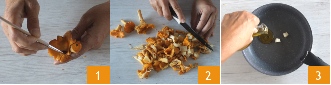 To prepare the mushroom and sausage risotto, first clean the chanterelles: remove the excess dirt by gently rubbing them with a cloth; then brush them with a soft-bristle brush 1 and finally, if necessary, scrape them with a smooth-bladed knife. If there is a lot of dirt, you can quickly pass the mushrooms under a stream of cold water. Then pat them dry. Cut the chanterelles into pieces 2, taking care to leave some mushrooms whole for the final plating. In a pan, pour 3 tablespoons of oil and the garlic clove 3.