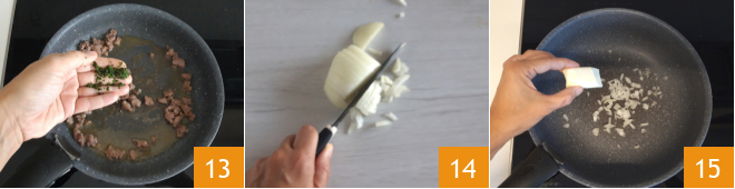 Prepare the sausage: cut it with a smooth-bladed knife and remove the casing 10. Crumble it with your hands 11. Place the sausage in a pan and brown it with about 2 teaspoons of oil, turning it often. It will take about 5 minutes.