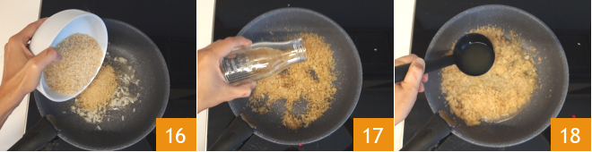Add the rice and toast it for a few minutes 16, stirring often. Deglaze with the white wine 17 and then lower the heat. Cook for 10 minutes, adding a little vegetable broth at a time when necessary 18.