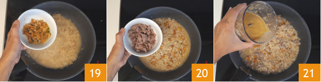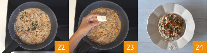 Add the mushrooms 19 and continue cooking for 5 minutes. Add the sausage 20 and finish cooking the risotto. At the end of cooking, add the mushroom cream and stir 21.