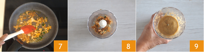 The mushrooms are ready 7, pour one-third of them into the mixer bowl 8; add a tablespoon of vegetable broth and blend until creamy 9 (remember not to blend the whole mushrooms that you will need for plating your risotto). Keep the mushroom cream aside until ready to use.