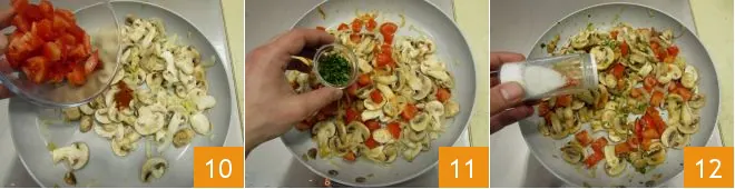Add the diced tomatoes 10 along with the coriander 11 and season with salt 12 and