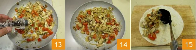 pepper to taste 13. After the necessary time has passed 14, turn off the heat and assemble the quesadillas. Take the tortillas (you can make them with our flour tortillas recipe) and fill half with the filling you have prepared, distributing it evenly 15.