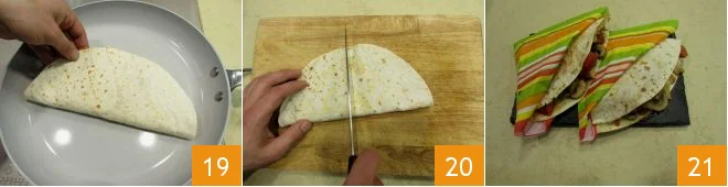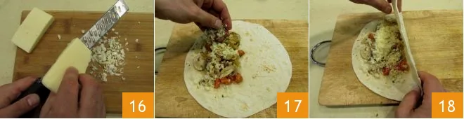 Grate the cheese 16 and sprinkle it over the filling 17, then fold the tortillas in half into a half-moon shape 18.