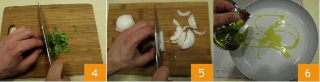 Finely chop the fresh coriander with a knife 4, then cut the onion into thin slices of about 4 mm (approximately 0.16 inches) 5. Put a non-stick pan on the heat with a drizzle of oil 6,