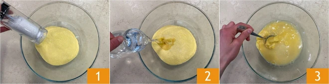 To make the nachos, start by preparing the tortillas: pour the pre-cooked cornmeal into a bowl with the salt 1 and warm water 2, then mix everything with a spoon 3.