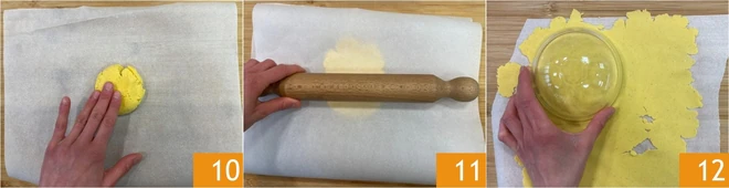 After this time, place the first piece of dough on a sheet of parchment paper and flatten it with your hands 10, then cover with another sheet of parchment paper and roll it out with a rolling pin until you form a very thin sheet 11. Don't worry if it tends to break; you can reuse the scraps, being careful to cover the dough while waiting so it doesn't dry out. Use a pastry cutter or a bowl with a diameter of 5 inches to cut the sheet 12.