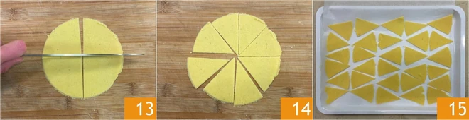 Cut the sheet into quarters first 13 and then into eighths to get 8 equal triangles 14. Place the triangles on a tray lined with parchment paper 15 and proceed in the same way to roll out the other dough pieces, always being careful to keep the dough you're not working on covered. You can stack the triangles on the tray as you cut them.