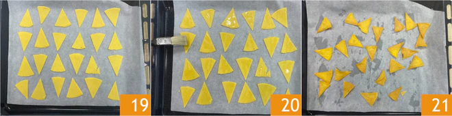 To bake the nachos, place the corn triangles on a baking sheet lined with parchment paper 19, then brush them with some peanut oil 20. Bake in a preheated fan oven at 374°F for 13 minutes, then remove from the oven and let cool 21. Your baked nachos are ready to be enjoyed or seasoned!