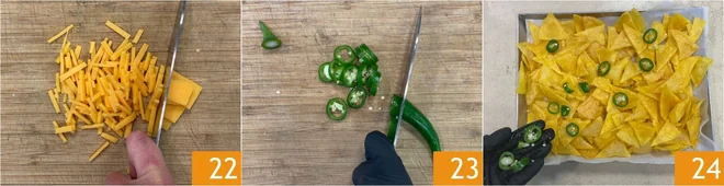 To make cheese nachos, finely chop the cheddar 22 and slice the chili pepper into rings 23. Arrange the nachos on a baking sheet lined with parchment paper and garnish with the jalapeno rings 34.
