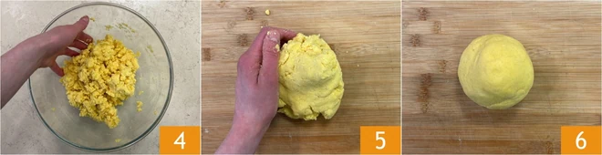 Continue combining the ingredients in the bowl with your hands 4, then transfer the mixture to your work surface and knead 5 until you get a smooth and even consistency 6.