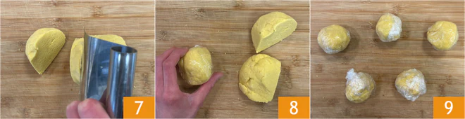 Divide the dough into 5 portions of about 3.5 oz each 7, shape each piece into a round shape 8, and wrap them in plastic wrap 9. Let them rest at room temperature for 5 minutes.