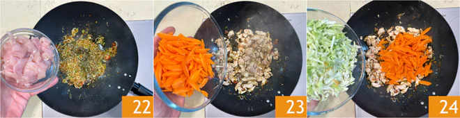 After a minute add the chicken 22 and briefly brown it. When it starts to change color, add the carrots 23 and cabbage 34 and toss everything.