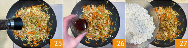 As soon as the vegetables have softened, season with salt and pepper 25, then deglaze with soy sauce 26 and mix well to flavor. At this point, add the rice 27.