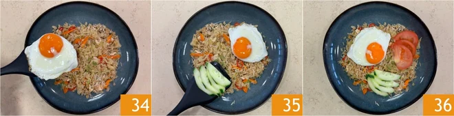 Plate the nasi goreng by placing the fried egg on top 34 and garnishing with the cucumbers 35 and raw tomatoes. The nasi goreng is ready to be served 36!
