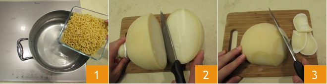 To prepare the nduja and cacio silano timbale, you can start by cooking the pasta in a pot of salted boiling water 1. Then proceed with the seasoning: cut the cacio in half to make it easier to slice 2, and with a knife, remove the tougher outer rind 3.