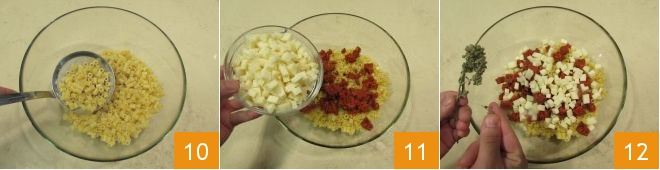 When the pasta is ready, drain it and transfer it to a bowl 10, add the nduja and diced cacio 11, and add the oregano 12.