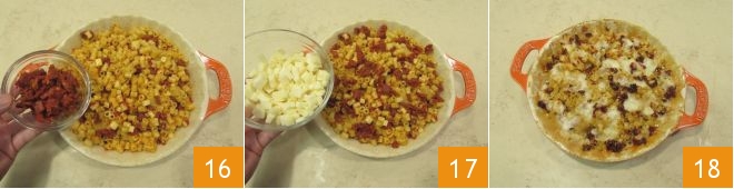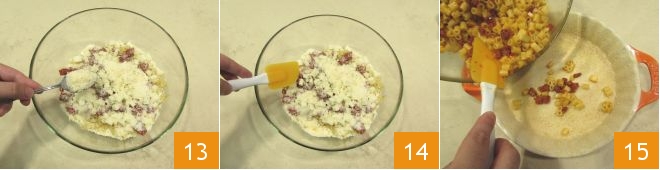 Add the grated cheese 13, mix well to incorporate all the ingredients 14, and transfer the mixture to the baking dish 15.