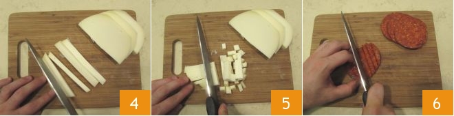 Cut into strips 4, then into cubes 5. Then take the nduja and do the same, slicing it first, then cutting it into strips 6