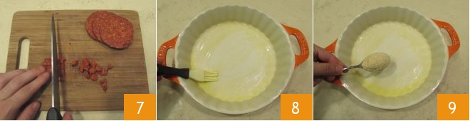 and finally into cubes 7. Remember to set aside 1.5 oz of nduja and 1.5 oz of cacio silano to add before baking. Take a baking dish, grease it with a kitchen brush 8, and sprinkle it with breadcrumbs 9.