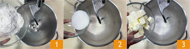 To prepare the babà, you need to place 3 eggs in the freezer the night before: we recommend cracking them and placing them in silicone molds to make them easier to extract. The butter and the remaining eggs should be cold from the fridge. Pour the flour 1 into a stand mixer, along with the sugar 2 and cold butter cut into pieces 3.