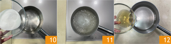 In the meantime, you can prepare the syrup which needs more resting, and which will be used to soak the babà before serving them. Pour the water and sugar into a small saucepan 10 and bring to a boil. Turn off the heat and let it cool completely. Only when it’s cold, can you add the 70° proof rum 12. Keep the syrup aside in the fridge, covered with plastic wrap.