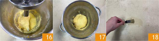 It will take at least 30-40 minutes for all the eggs to be fully incorporated 16, we suggest not to rush at this stage. At most, you can occasionally increase the speed of the stand mixer, but the dough should not get excessively warm, otherwise, the gluten network will not form properly. Once the dough is ready 17, oil the molds of about 70 g capacity, then lightly oil the work surface 18.