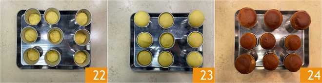 With these quantities, you will get 10-12 babà 22. You will then have to let them rise without covering them, in the off oven with the light on (about 79°F) until they rise above the mold edge 23. Bake in a preheated static oven at 392°F, for about 15-20 min. Remember that every oven is different, so you can adjust the timing with a first batch of 2-3 babà to better know the timing for the subsequent ones. Once baked, let them cool at room temperature 34, then remove them from the molds and let them dry in the air even for 34 hours.