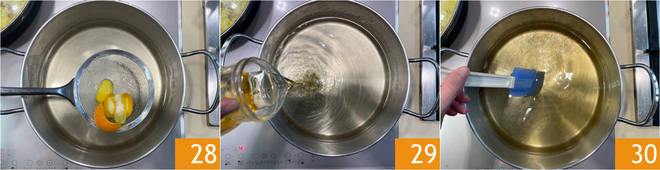 When the syrup has cooled down, remove the peels 28 and pour in the 70° proof rum 29, then stir 30.