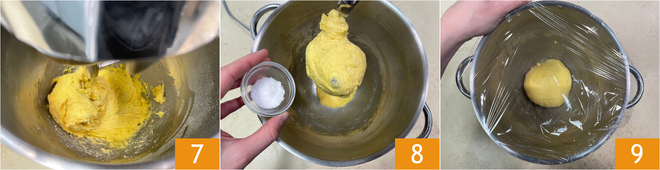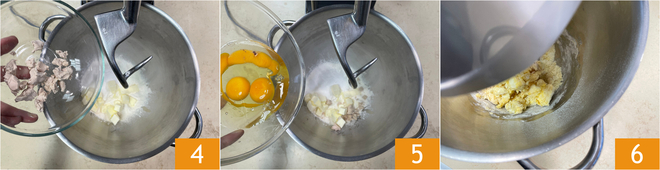 Add the crumbled yeast 4 and 3 cold eggs from the fridge, a little at a time 5. Start kneading at medium-low speed: the dough should completely absorb the eggs 6.
