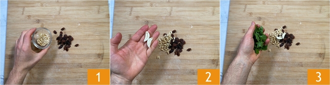 To prepare the Neapolitan ragù, first, prepare the braciole. Place the raisins (without soaking them), pine nuts 1, peeled and degermed garlic 2, and parsley leaves 3 on the cutting board.<\/p>