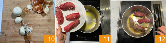 Peel and finely chop the onions 10. Move to the stove. In a large pot, preferably with a double bottom, heat a drizzle of oil and then add the braciole 11, letting them seal over high heat. Turn them gently with tongs 12, browning well on all sides, then set aside.<\/p>