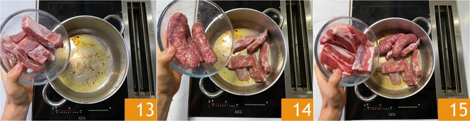 Continue with the other cuts of meat, first adding the pork ribs 13. Then add the sausages 14 and the beef short ribs 15.<\/p>