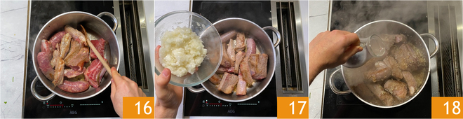 Brown all the pieces of meat well 16. At this point, add the onion 17 and slightly increase the heat. Stew for a couple of minutes and finally deglaze with the red wine 18 to deglaze the bottom.<\/p>