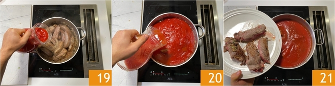 As soon as the alcohol evaporates, add the tomato puree 19, rinse the jug with 2 quarts of water 20, and plunge in the braciole 21.<\/p>