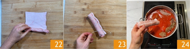 Roll up the pork skin 22 tying it with a string 23. Add it to the sauce 34 and add a good pinch of salt.<\/p>