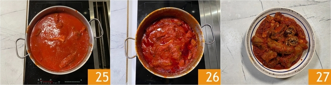 Let it simmer gently 25 over low heat for 4 hours. Occasionally remember to stir, so the onion and sauce don't stick to the bottom 26. Adjust the salt and your ragù is ready to use 27.<\/p>
