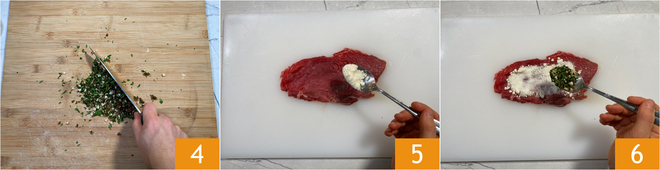 Chop everything quite finely 4. Lay out a slice of top sirloin on a cutting board, if it's too thick, pound it a bit between two sheets of parchment paper. Sprinkle with some grated pecorino Romano cheese 5 and the freshly prepared mixture 6; make sure to leave an edge and not cover the entire slice of meat.<\/p>