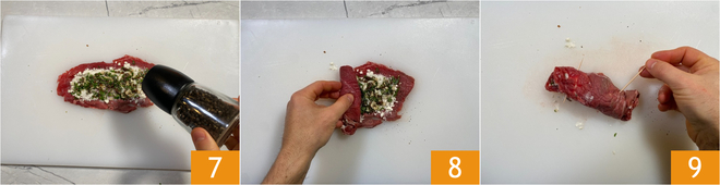 Add a dash of black pepper 7. Roll up from the shorter side like this: tuck the ends inward, then roll the meat 8 and secure the rolls with toothpicks, two on the sides 9 and one in the center 9.<\/p>