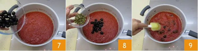 In the meantime, desalinate the capers by soaking them in a bowl with cold water 4 and then drain them 5 while waiting to add them to the pan. When the sauce is finished cooking, remove the garlic from the pan 6,