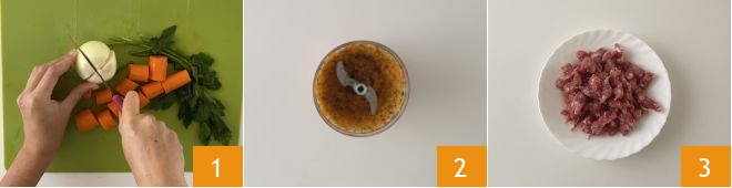 To prepare the nests of tagliatelle with sausage ragù, first peel the carrots and onion. Cut them into large pieces 1 and blend them in a mixer along with the celery sprig 2. Crumble the sausage onto a plate and set it aside 3.