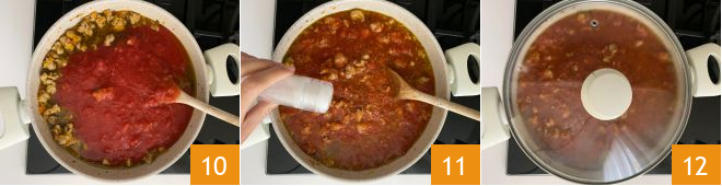 add the tomato sauce 10. Season with salt 11 and pepper, then cover with a lid 12 and let cook for 40 minutes.