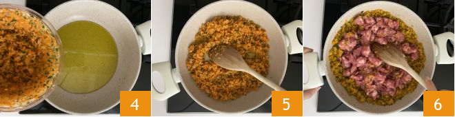 Pour the oil into a saucepan, add the soffritto 4, and let it sauté for a couple of minutes 5. Add the sausage and let it brown 6.