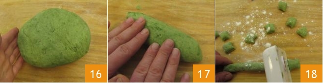 When you have obtained a soft but homogeneous dough 16, sprinkle the work surface with semolina flour, then divide the dough into pieces to shape into logs about 1 inch thick 17; Cut the logs into pieces with a dough scraper 18 or with the blade of a slightly floured knife.