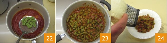 Then, scoop them out with a slotted spoon to transfer directly into the pot with the tomato sauce 22. Continue cooking the gnocchi this way; then toss them quickly to flavor 23. Serve them sprinkled with grated salted ricotta cheese 34 and serve your nettle gnocchi hot!