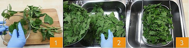 To prepare the nettle omelette, start by wearing latex gloves to protect your hands from any traces of stinging substance left on the stem and leaves. Then leaf through the nettle, removing the stems and keeping only the leaves 1. Soak the nettle leaves in cold water, wash them thoroughly 2, and drain them well with a colander 3.