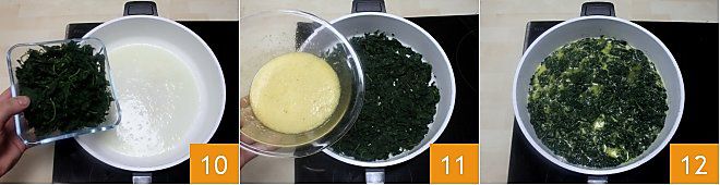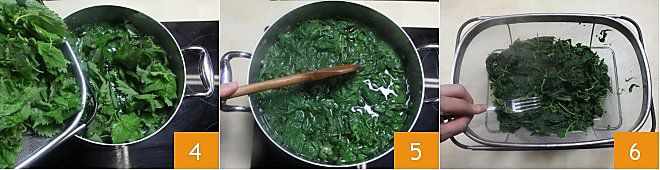 At this point, boil some water in a pot, salt it, and cook the nettle leaves for about 10 minutes 4. When they have softened and reached a more intense color 5, drain them in a colander and, using the back of a fork, push the cooked leaves towards the sieve to release all the liquid absorbed during cooking 6 and set aside.